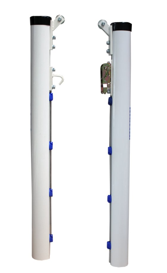 Juego de postes fabricados en aluminio nervado de sección redonda 90mm. Diseñados para anclar al suelo mediante botes metálicos* -incluidos- empotrados en zapata de hormigón. Incluye carraca tensora para poder tensar el cable de la red que se quiera colocar. Se fabrican para que la red quede a la altura reglamentaria de 1,07mts.
