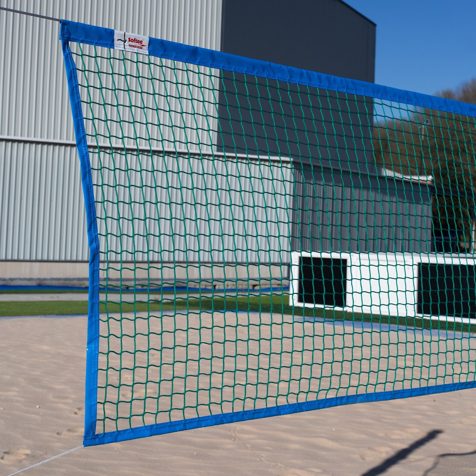2,3mm Polipropileno en verde, malla de 45x45mm con cinta azul por todo el perímetro (la superior de 5cm a cada lado y la de los laterales + inferior de 3cm cada lado), con cuerda . Medidas 8,55×1,0mts