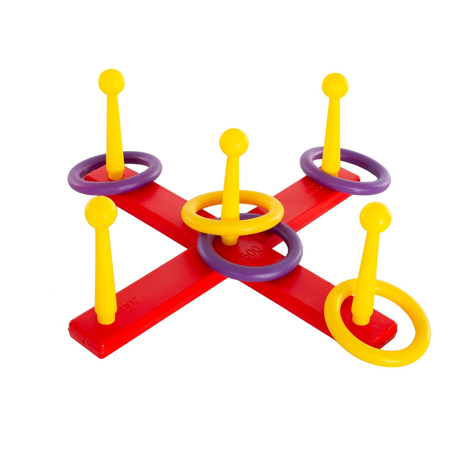 Set formado por 1 base y 6 aros. Colores aros: 2 amarillos, 2 naranjas y 2 verdes. Presentación en bolsa con blister. Para realizar tareas de lanzamiento y precisión. Soporte en forma de cruz para lanzar los 4 aros hasta 5 puntos diferentes. Medida: 46x46x6,5cm. Aro: 12cm.